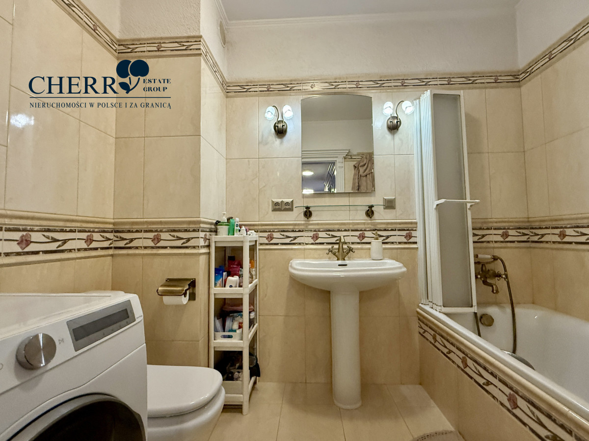 Łazienka jest przestronna, zadbana i utrzymana w klasycznej, neutralnej kolorystyce. Wyposażona w wannę z funkcją prysznica, umywalkę oraz miejsce na pralkę.