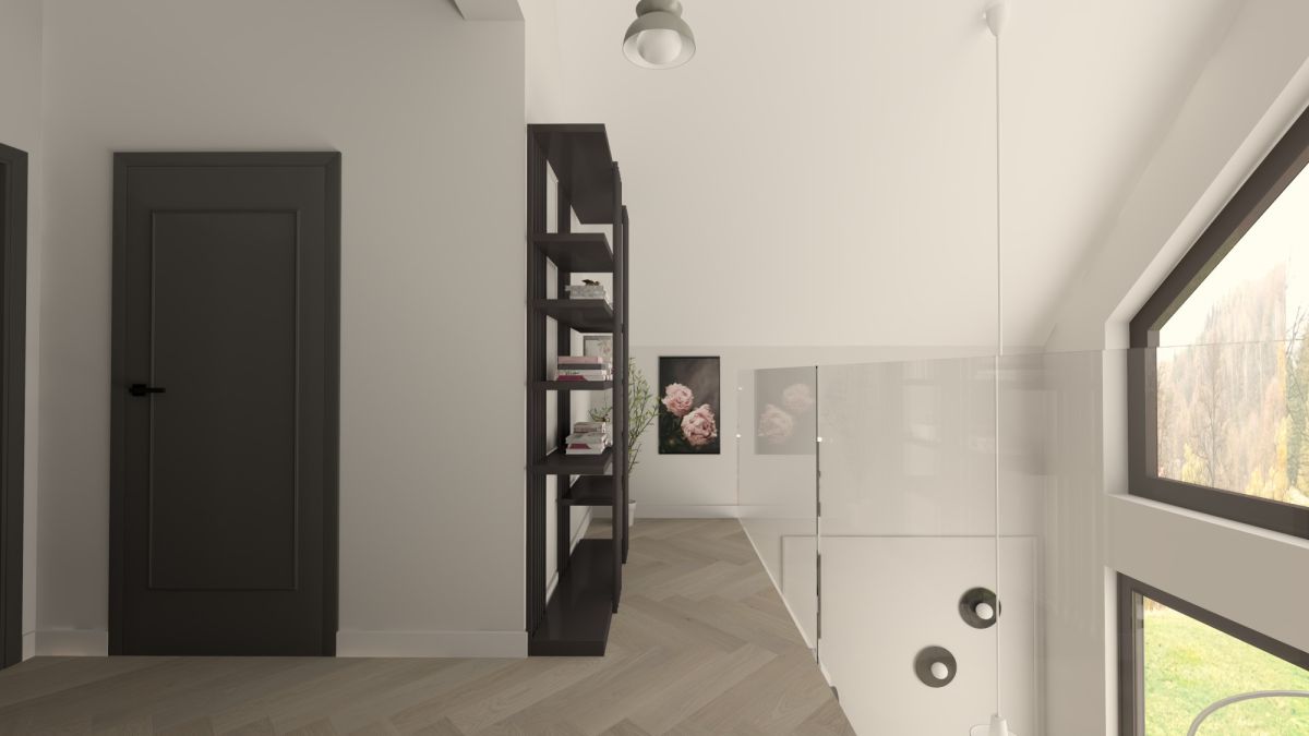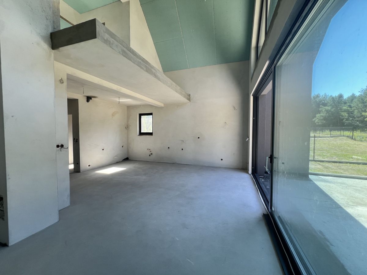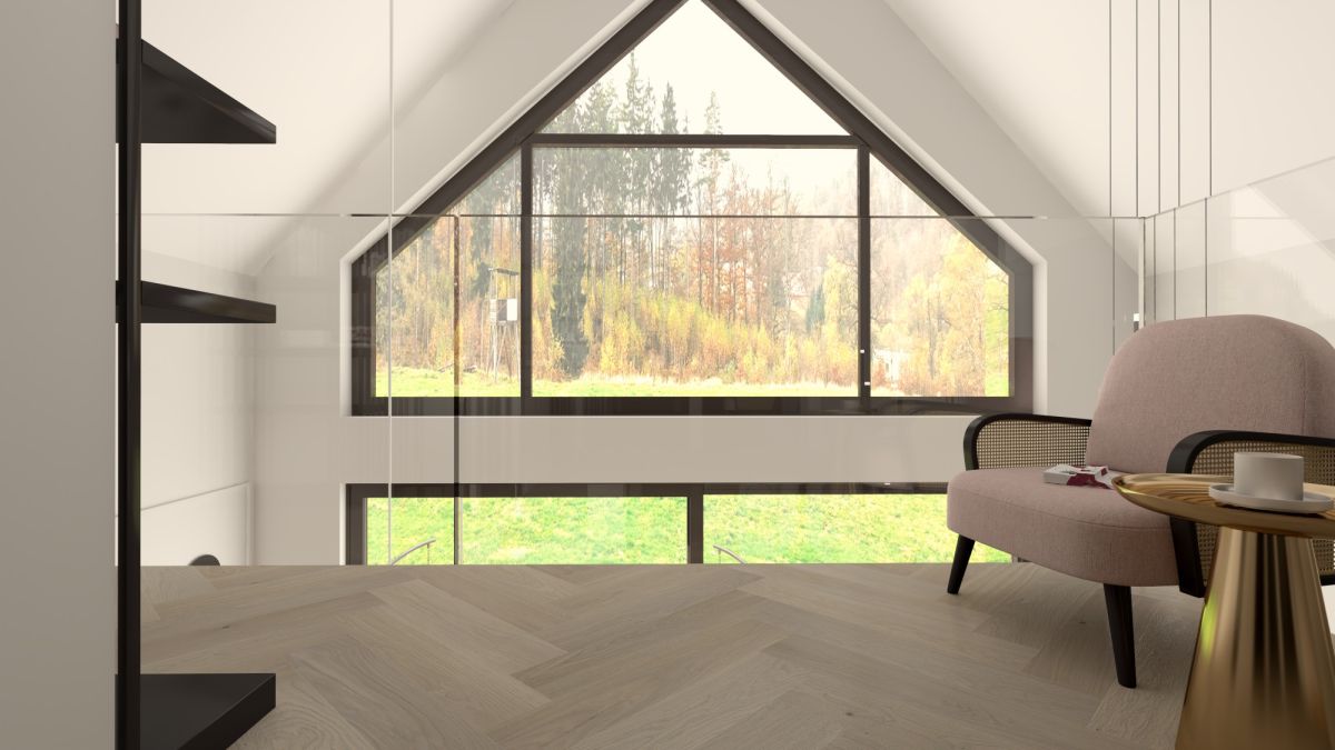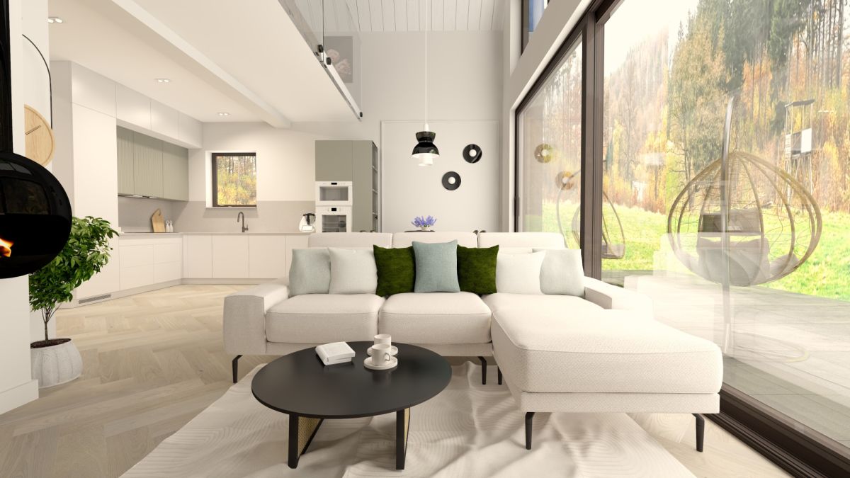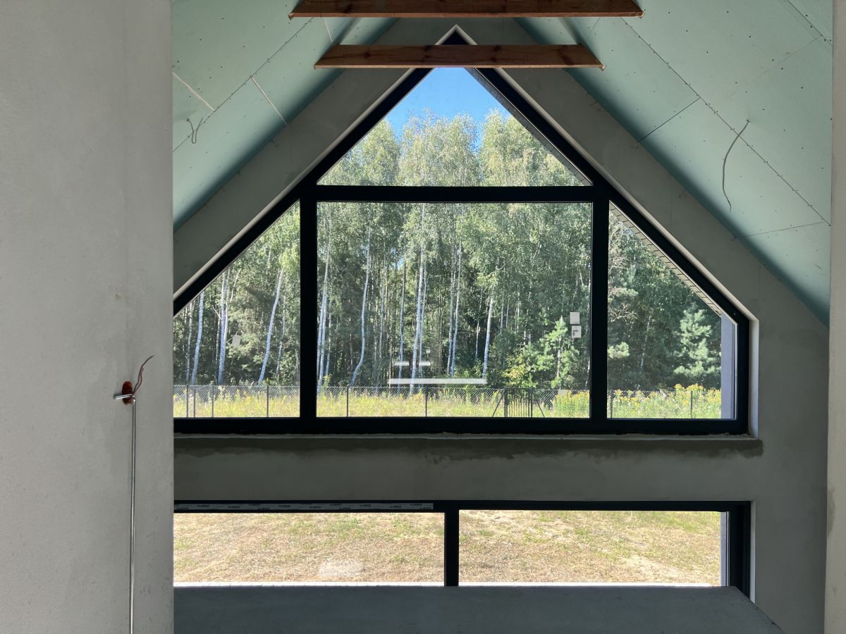 Dom wyposażony jest w dwa tarasy oraz balkon, oferując liczne miejsca do wypoczynku na świeżym powietrzu. Duże przeszklenia zapewniają doskonałe doświetlenie wnętrz oraz piękne widoki na otaczający las.