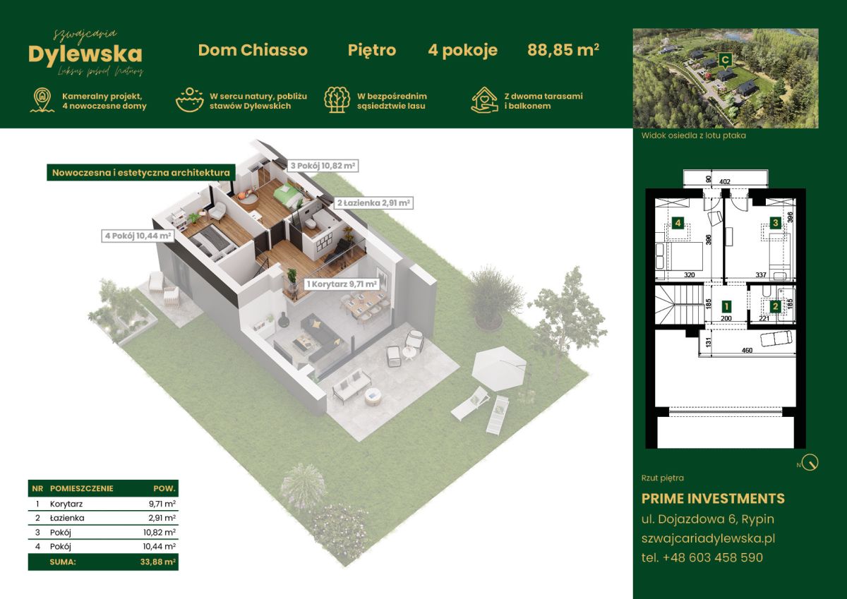 Dom znajduje się w malowniczej miejscowości Dylewo, tuż obok Rypina. Lokalizacja ta zapewnia wyjątkowy kontakt z przyrodą - bezpośrednie sąsiedztwo lasu oraz bliskość Stawów Dylewskich tworzą idealne warunki do życia w spokoju i harmonii. Okolica sprzyja aktywnemu wypoczynkowi na świeżym powietrzu, oferując liczne ścieżki spacerowe, trasy biegowe oraz możliwości wędkowania. Dodatkowym atutem jest szybki dostęp do centrum Rypina (10 minut samochodem), a także dogodne połączenia do większych miast, takich jak Warszawa (140 km).