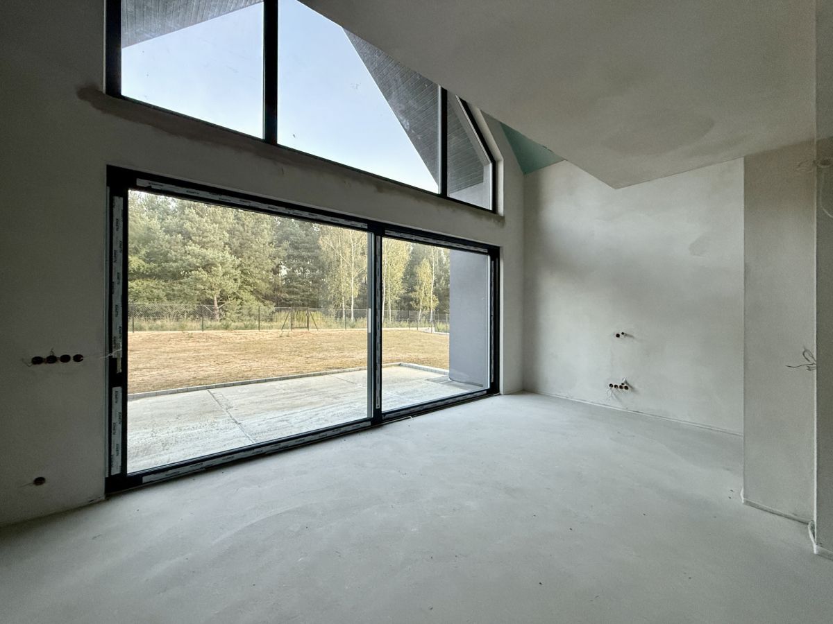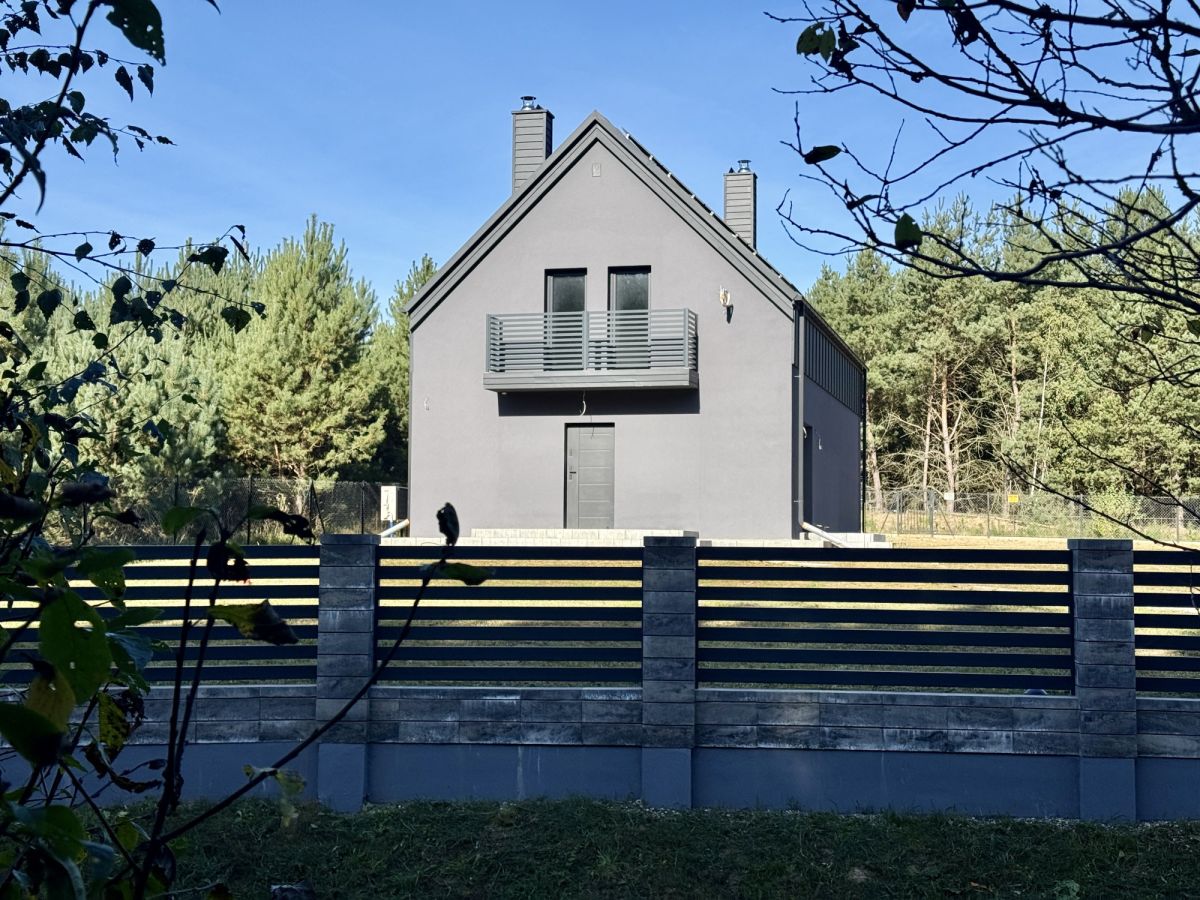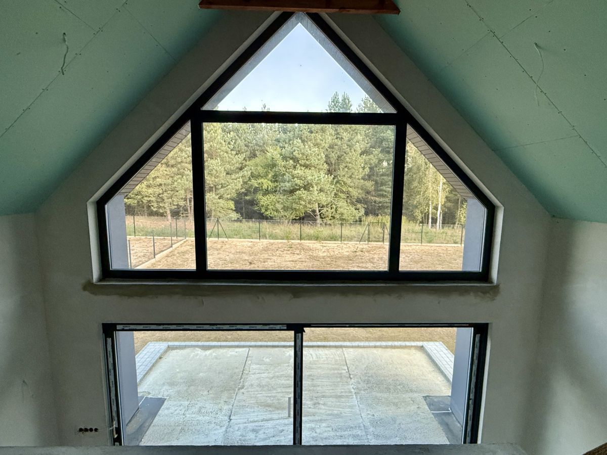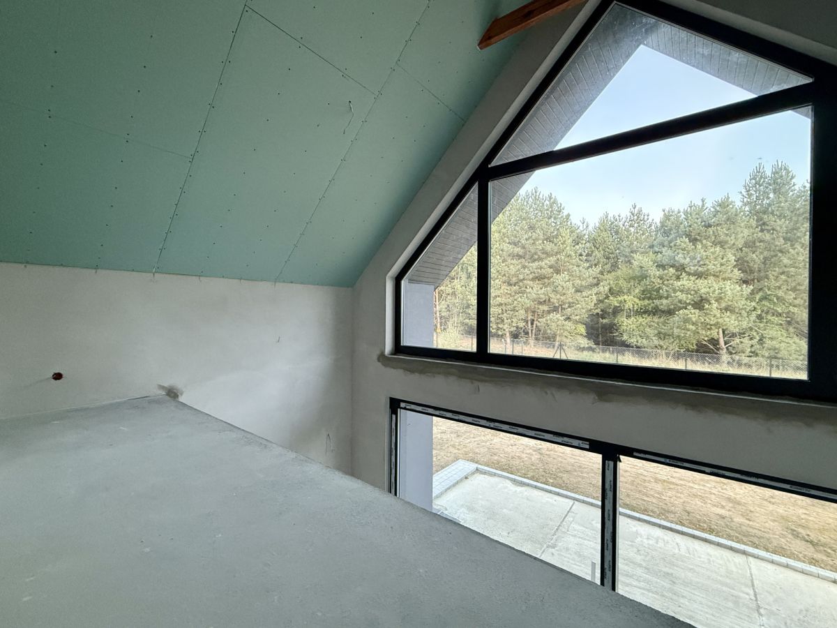 Dom wyposażony jest w dwa tarasy oraz balkon, oferując liczne miejsca do wypoczynku na świeżym powietrzu. Duże przeszklenia zapewniają doskonałe doświetlenie wnętrz oraz piękne widoki na otaczający las.