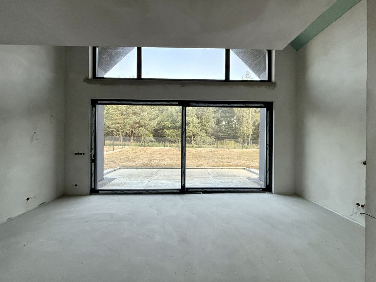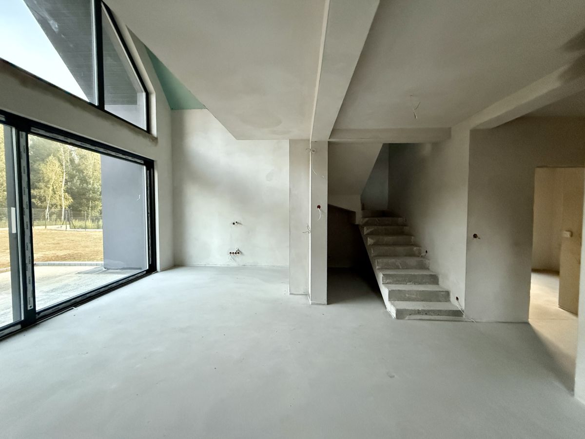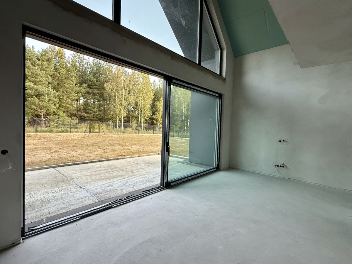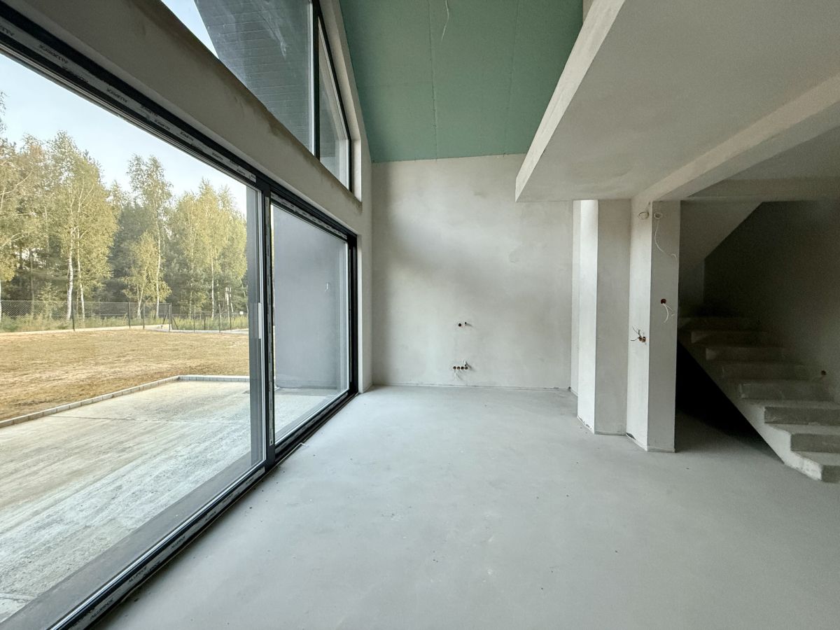 Dom wyposażony jest w dwa tarasy oraz balkon, oferując liczne miejsca do wypoczynku na świeżym powietrzu. Duże przeszklenia zapewniają doskonałe doświetlenie wnętrz oraz piękne widoki na otaczający las.