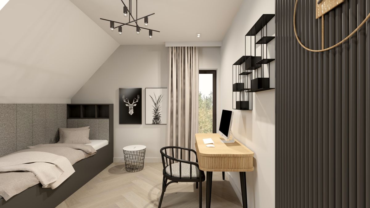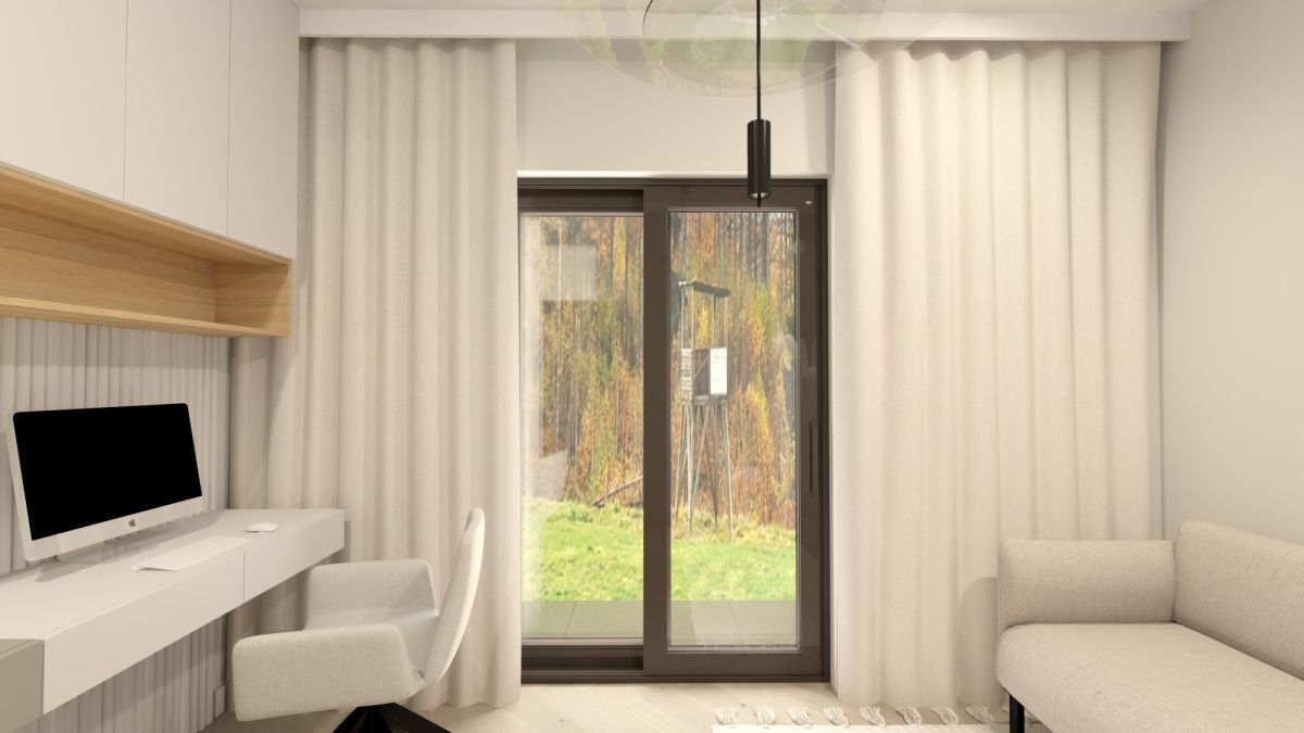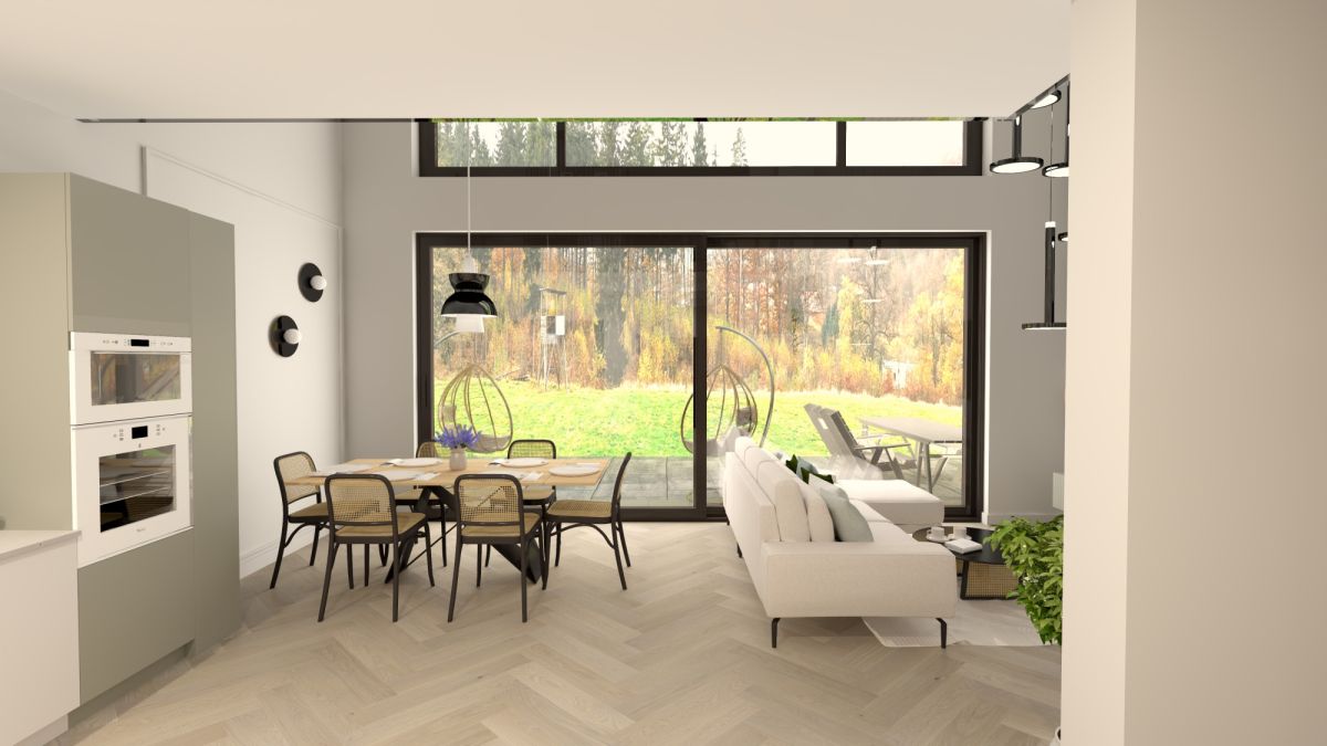 Dom wyposażony jest w dwa tarasy oraz balkon, oferując liczne miejsca do wypoczynku na świeżym powietrzu. Duże przeszklenia zapewniają doskonałe doświetlenie wnętrz oraz piękne widoki na otaczający las.