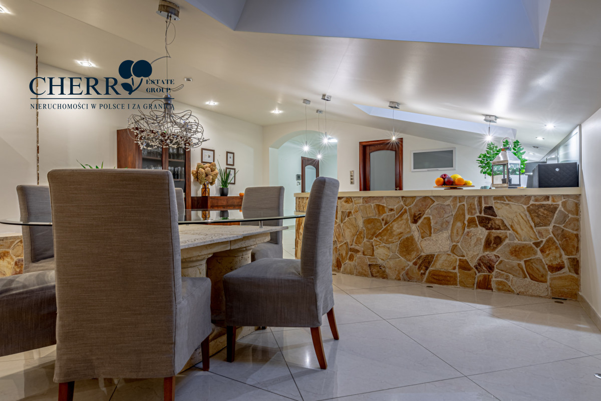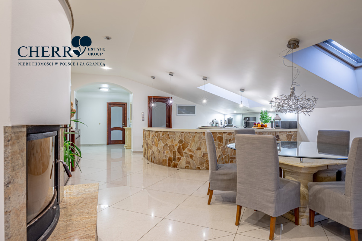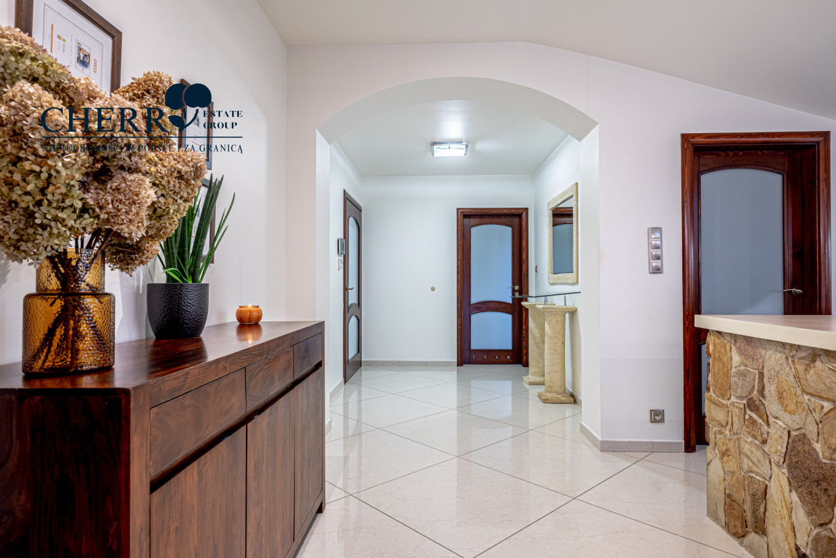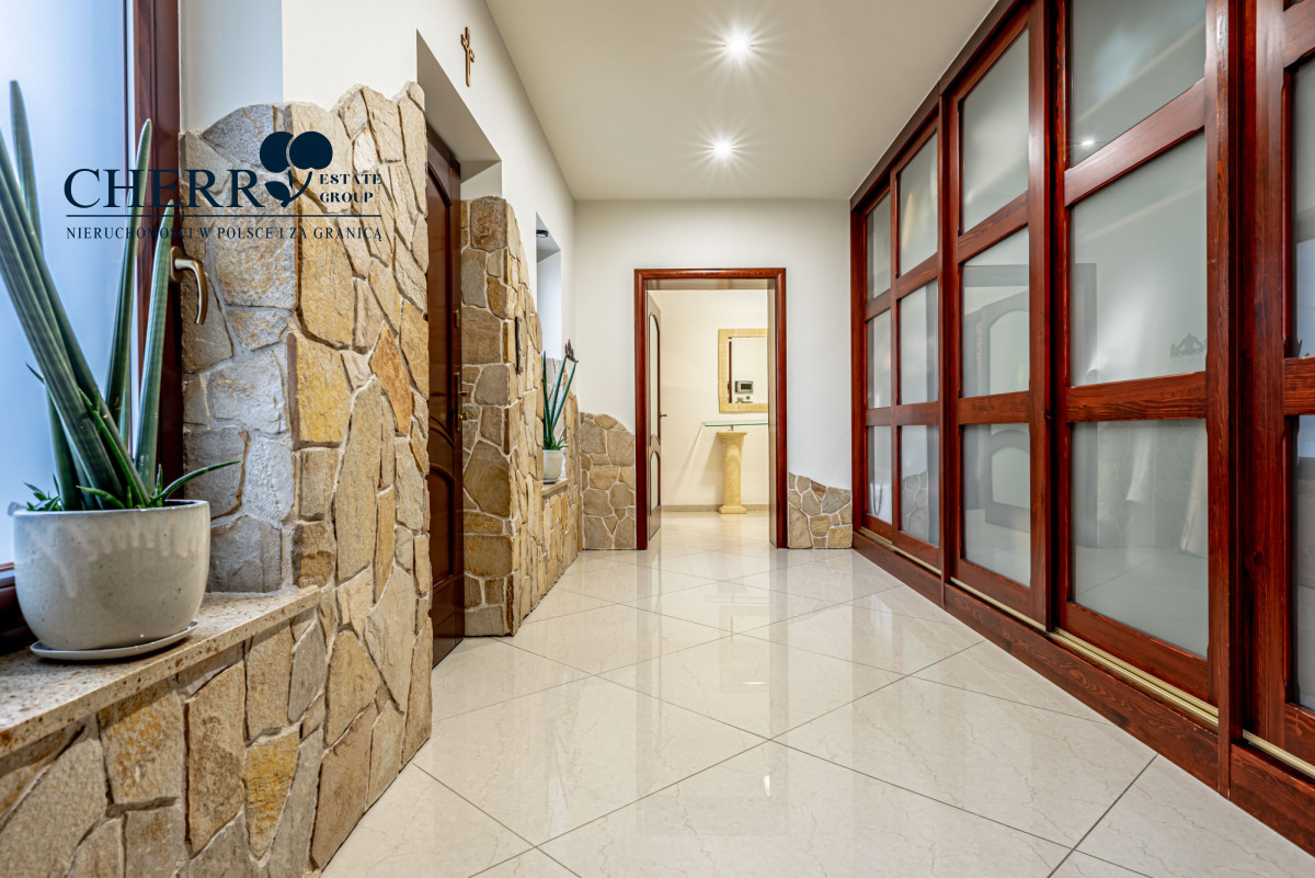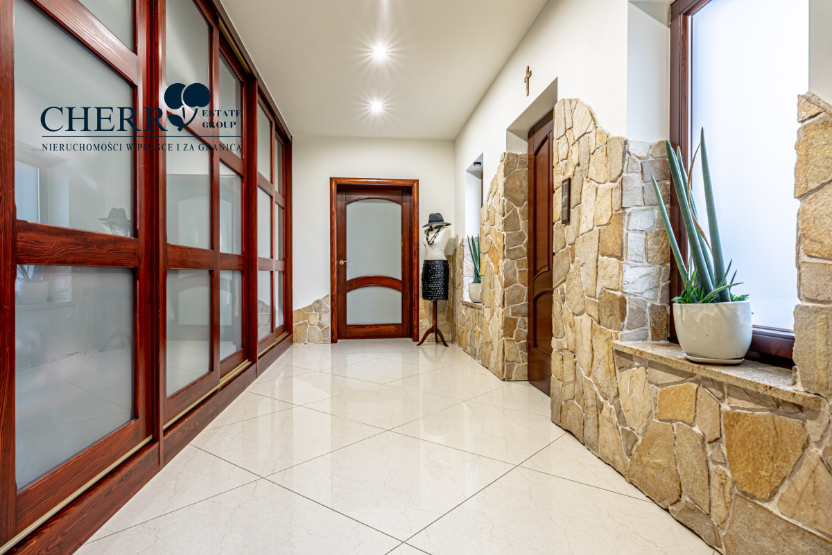Wnętrze domu utrzymane jest w stylu grecko-rzymskim, z dominującym motywem kamienia i piaskowca. Stolarka drzwiowa i meblowa w kolorze ciemnego mahoniu nadaje całości elegancji i ciepła.
