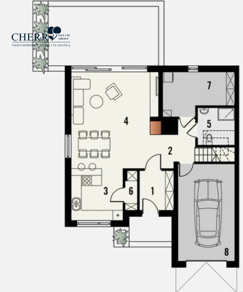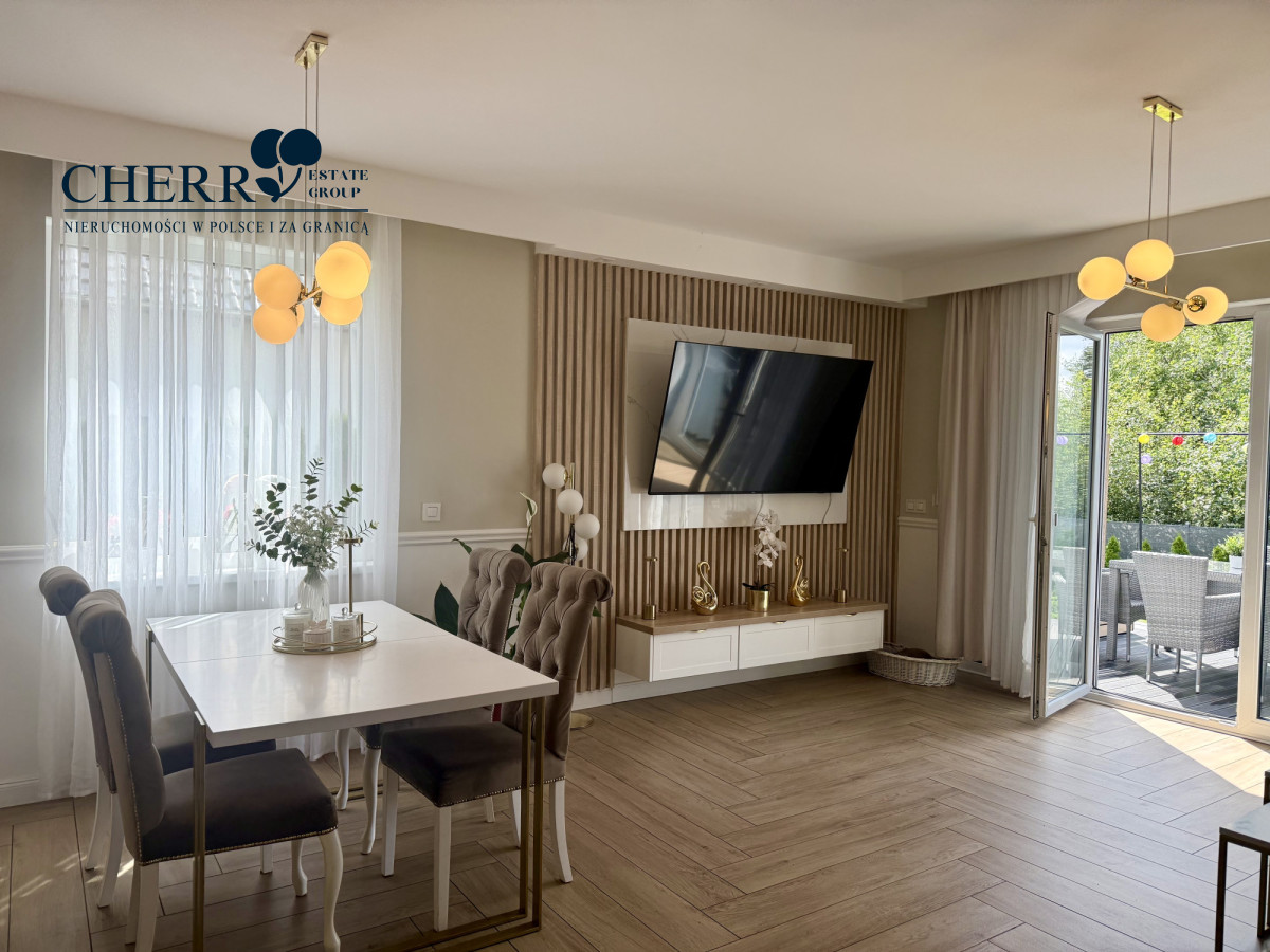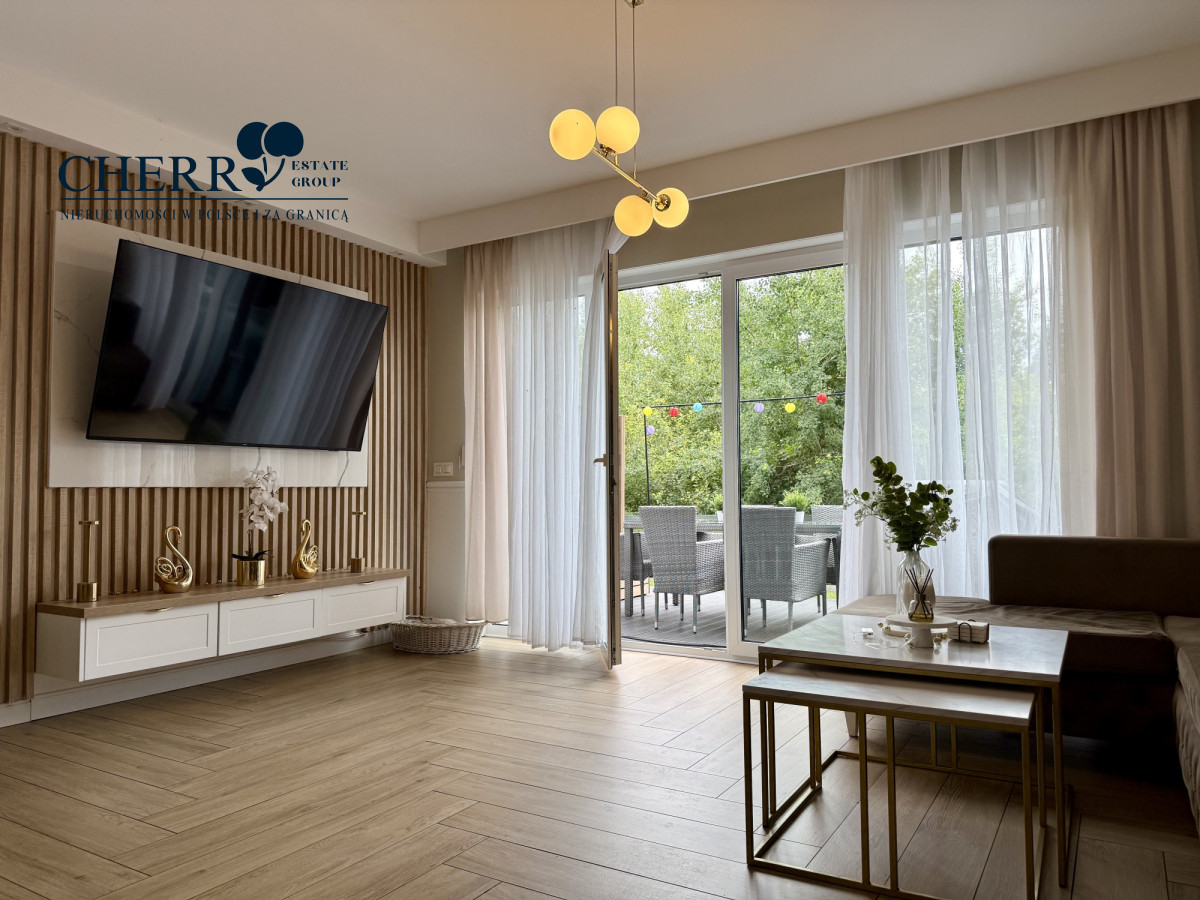 - Przestronny salon z aneksem kuchennym i wyjściem na ogród