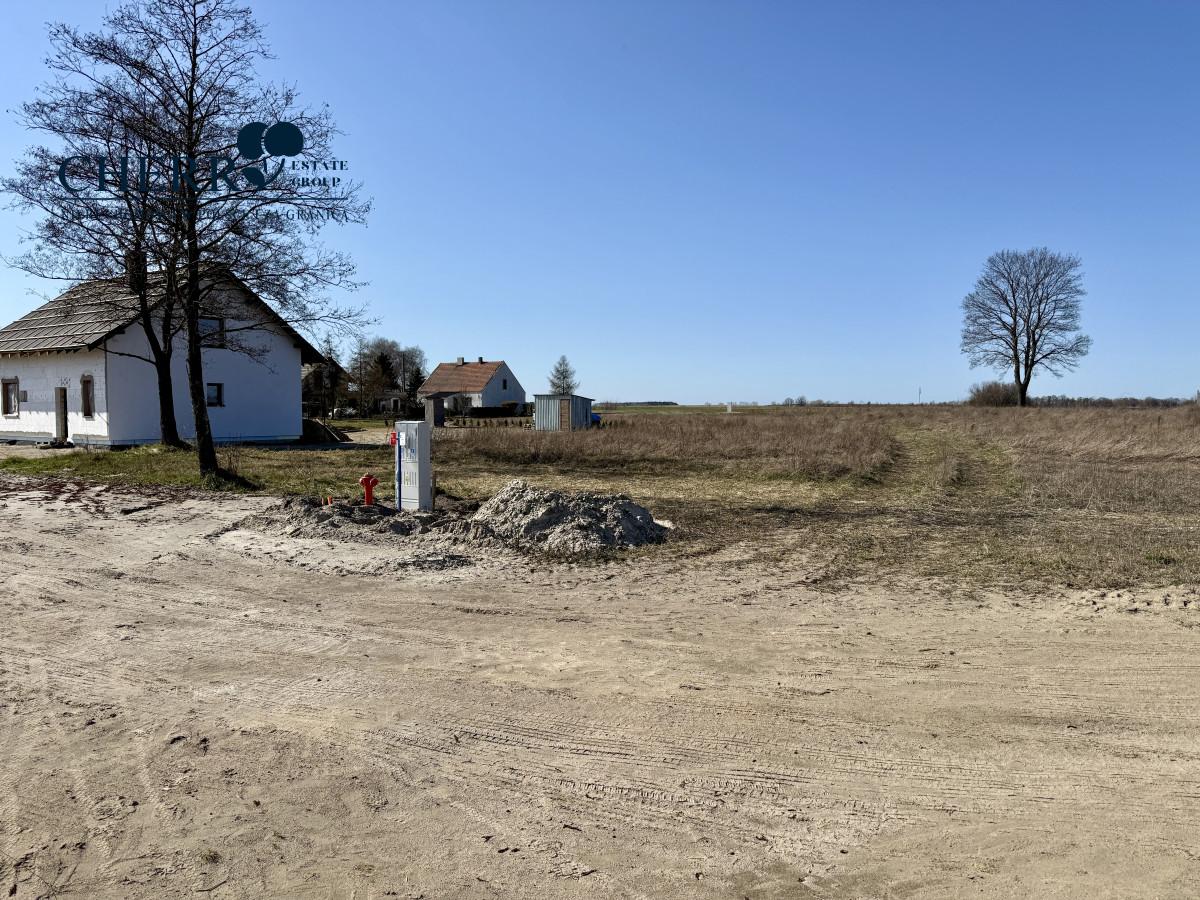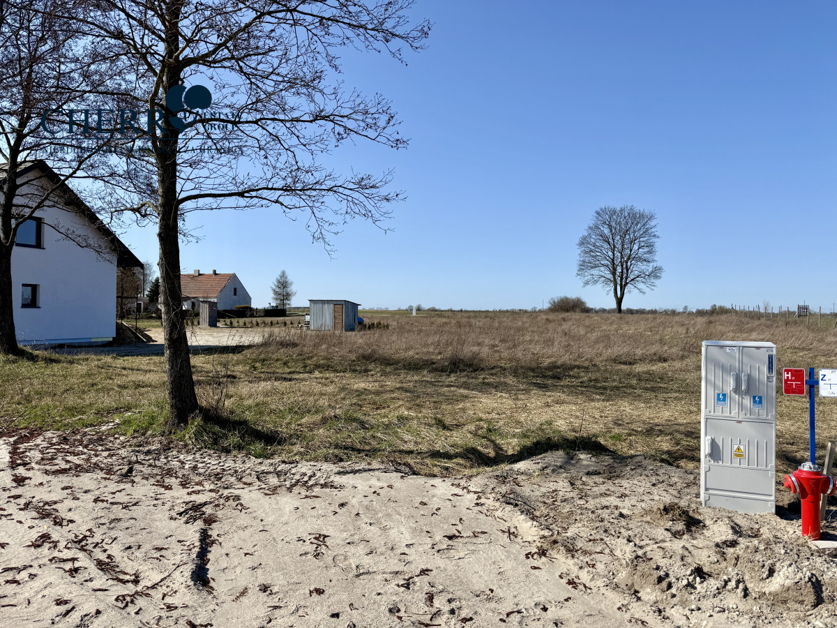 Na granicy działki znajduje się skrzynka elektryczna oraz hydrant, co pozwala na szybkie rozpoczęcie realizacji budowy.