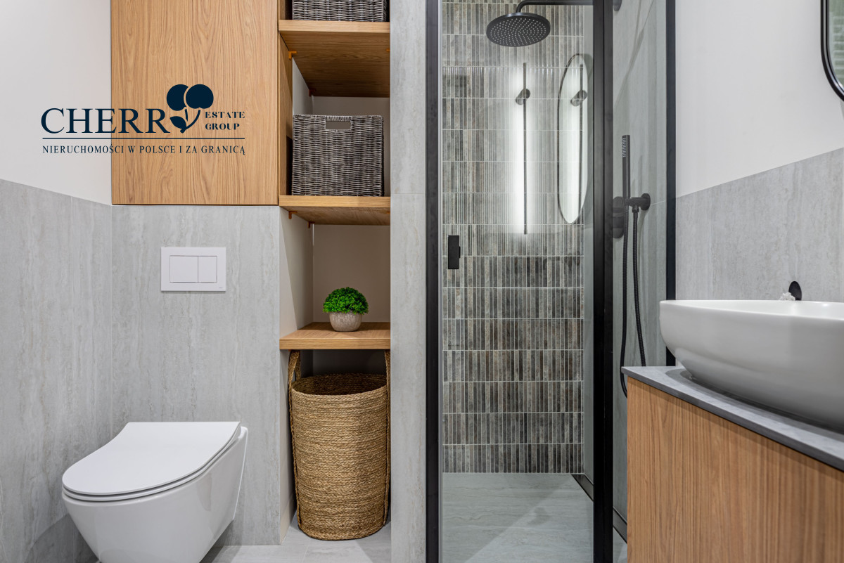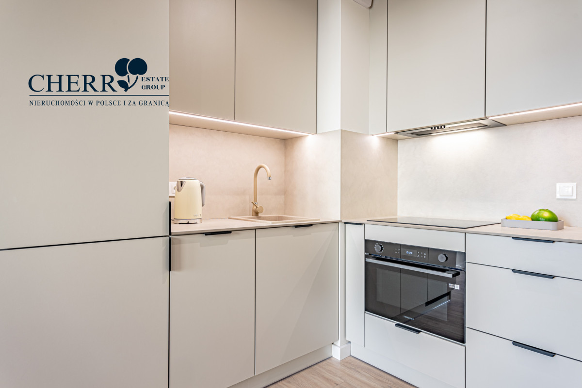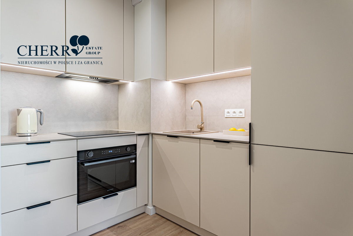 • Wyposażenie: pełne AGD (lodówka, piekarnik, płyta indukcyjna, zmywarka, pralka) oraz meble w zabudowie na wymiar
